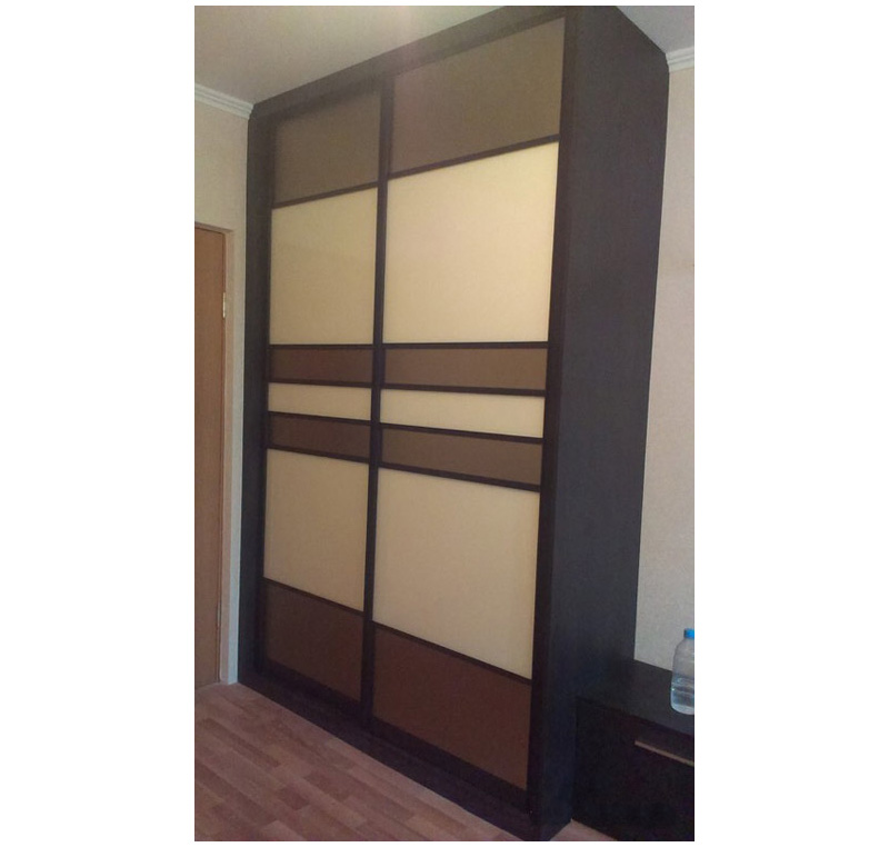 Двустворчатый шкаф-купе обладает двумя секциями для различных видов одежды. Фасад модели исполнен в сочетании ДСП цвета венге и матового лакобеля. Широкие створки двигаются бесшумно и легко.
