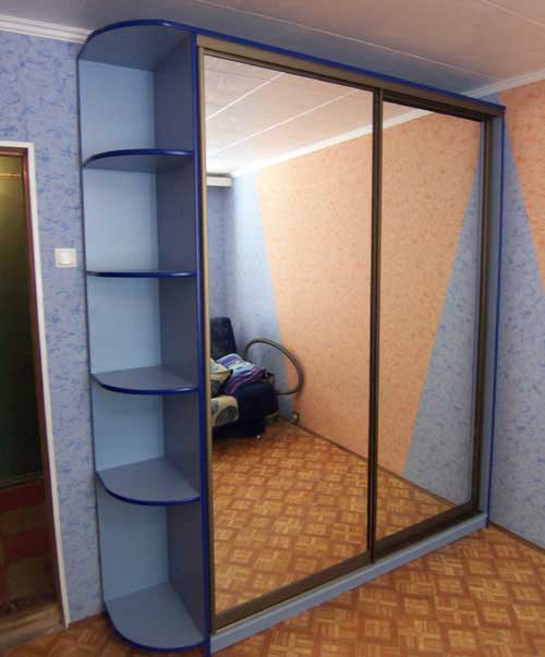 Двухдверный шкаф-купе с радиусными полками исполнен в синем цвете. Корпус модели изготовлен из ДСП, фасад зеркален.