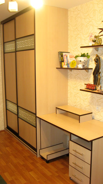 Данный линейный шкаф-купе станет незаменимым вариантом для небольшой детской комнаты или домашнего кабинета в классическом или современном стиле. Шкаф-купе имеет очень функциональную линейную конструкцию, которая также дополнена компьютерным столом с открытыми полками для книг и элементов декора.