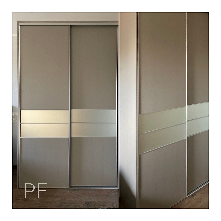 Двери в шкаф-купе: Pan Fasad ТМпрофиль MS-162, цвет Серебро. Наполнение - плита Evogloss 10 мм, цвет Матовый Вижен Р732. Центральная вставка - зеркало Сатин.