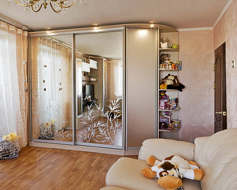 Светлый шкаф-купе для детской отличается стильным дизайном и изысканным исполнением фасадов. Широкое зеркало декорировано легким пескоструйным рисунком. В боковой части расположены радиусные полки для всякой всячины. Шкаф оборудован подсветкой точечными светильниками, которые ярко освещают шкаф и пространство комнаты рядом со шкафом.