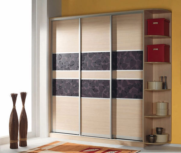 Шкаф-купе исполнен в светлых тонах, посередине имеются вставки темно-фиолетовых с узорами. Удобным дополнением к модели станут пять радиусных полок. Три раздвижные створки плавно открываются, снабжены заглушками.