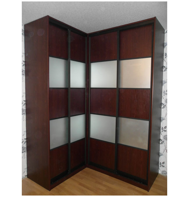 Шкаф-купе обладает внушительным объемом и вместительностью. Угловая конструкция максимально задействует пространство, позволяя сэкономить место в помещении. Модель окрашена в цвет орех с серебристыми вставками.