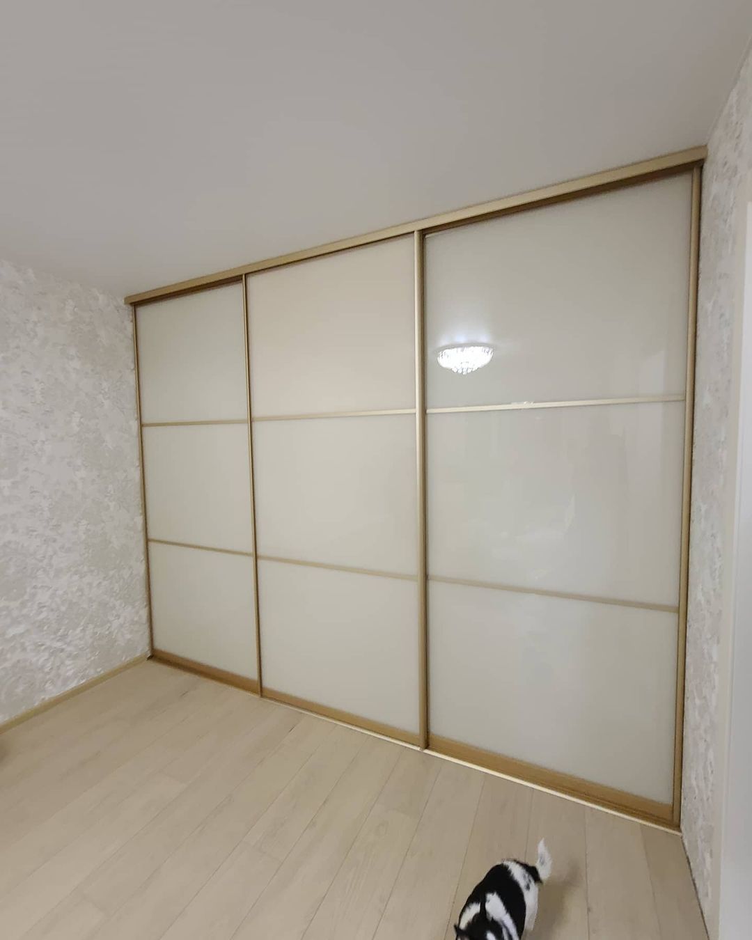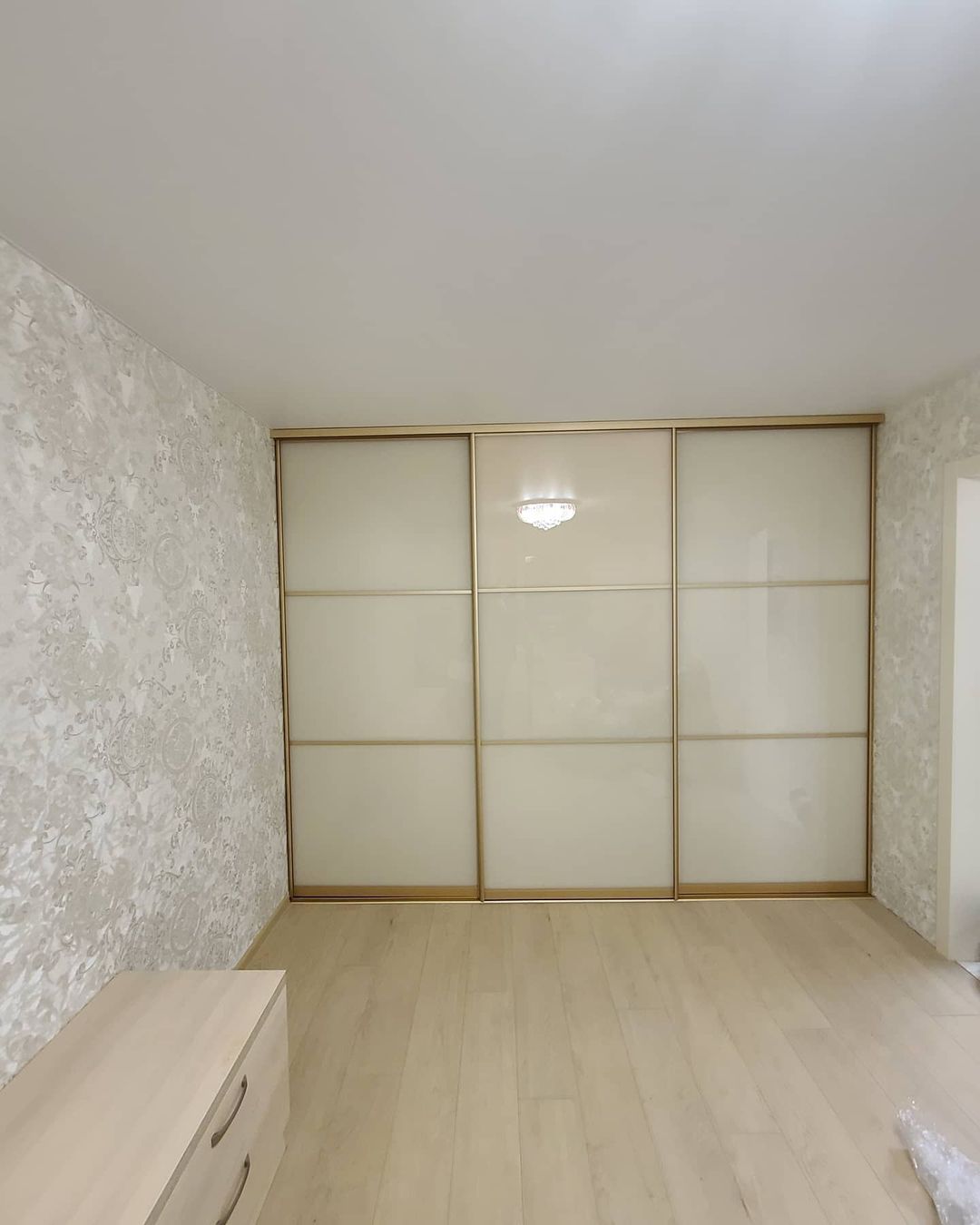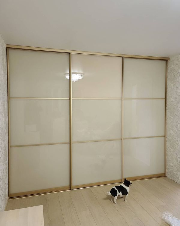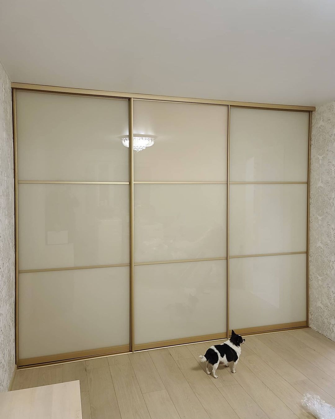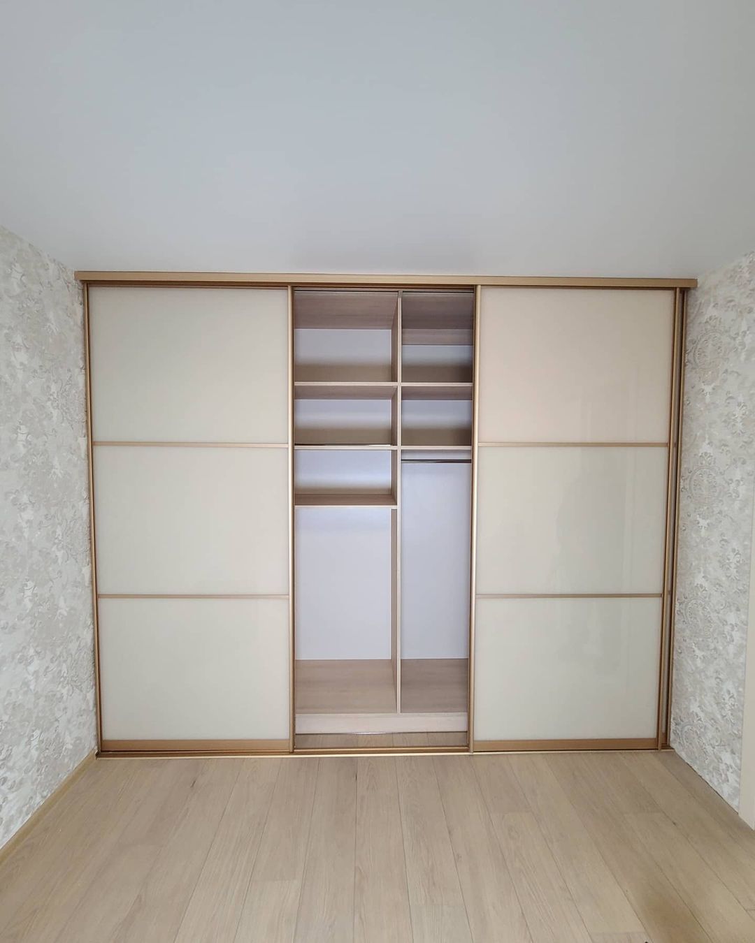 Светлый шкаф-купе бежевого цвета. Вставки лакомата по центру фасада.
