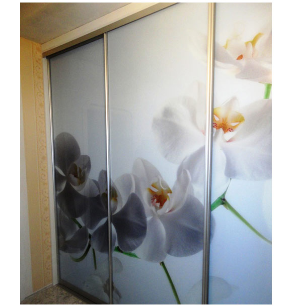 Линейный шкаф-купе оснащен тремя раздвижными створками, яркая особенность дизайна которых – красочная фотопечать на фасаде с изображением цветов белой орхидеи, которая точно сделает любой современный интерьер особенно романтичной и нежной. Внутри предусмотрено большое количество различных отделений и полок, а также штанги для вешалок.