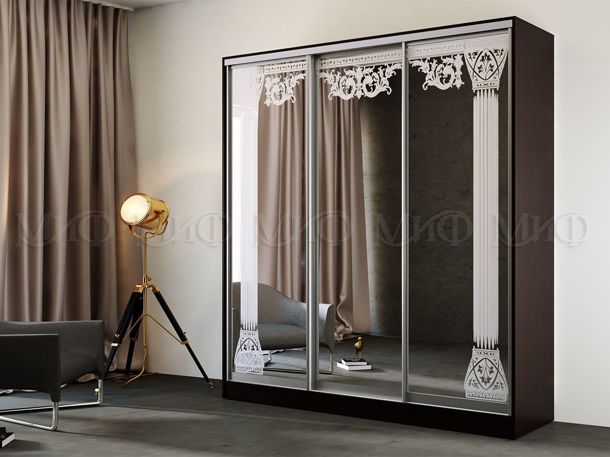 код 102988Трехстворчатый шкаф-купе с зеркальными створками декорированными пескоструйным узором.