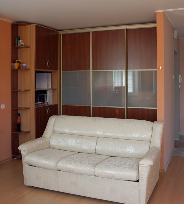 Угловой шкаф-купе станет функциональным дополнением к гостиной или спальной комнате. Фасад выполнен в сочетании ДСП цвета орех и матового лакобеля.