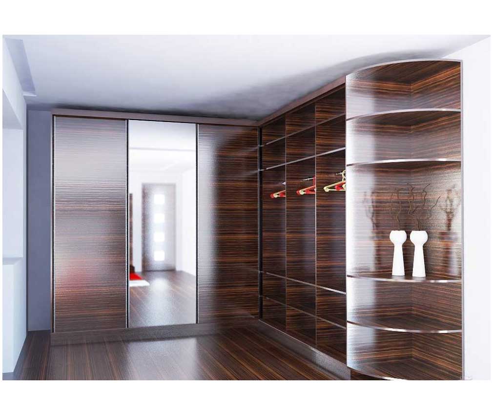 Угловой шкаф-купе с открытой и закрытой частями, а также радиусным модулем, в котором находится пять полок для книг или декоративных элементов интерьера. Средняя дверца закрытой части конструкции представляет собой ростовое зеркало. Открытый модуль оснащён двенадцатью нишами для обуви, одежды и головных уборов.