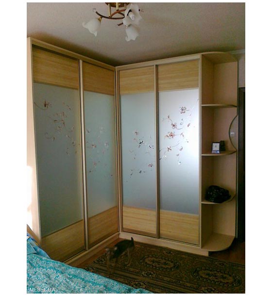Угловой шкаф-купе отлично впишется в спальную комнату. Она обладает внушительными габаритами, что подразумевает ее высокую вместительность. Сбоку предусмотрены боковые полки.