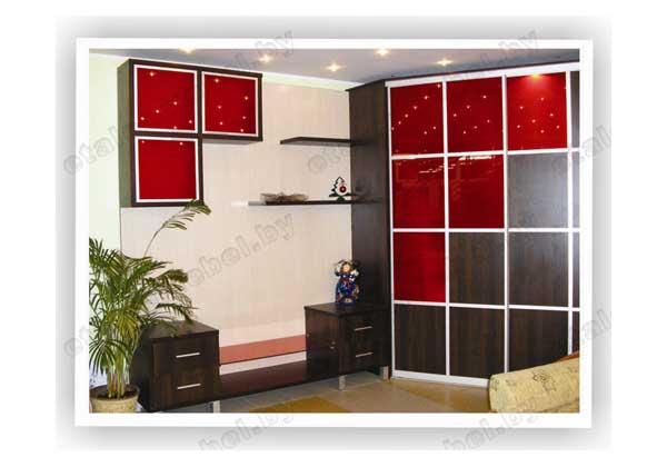 Угловой шкаф-купе комплектуется дополнительными угловыми модулями и отлично подойдет для гостиной комнаты. Фасады представляют собой контрастное сочетание красного лакобеля и ДСП цвета венге. Эффектный внешний вид модели сделает интерьер ярким и красочным.
