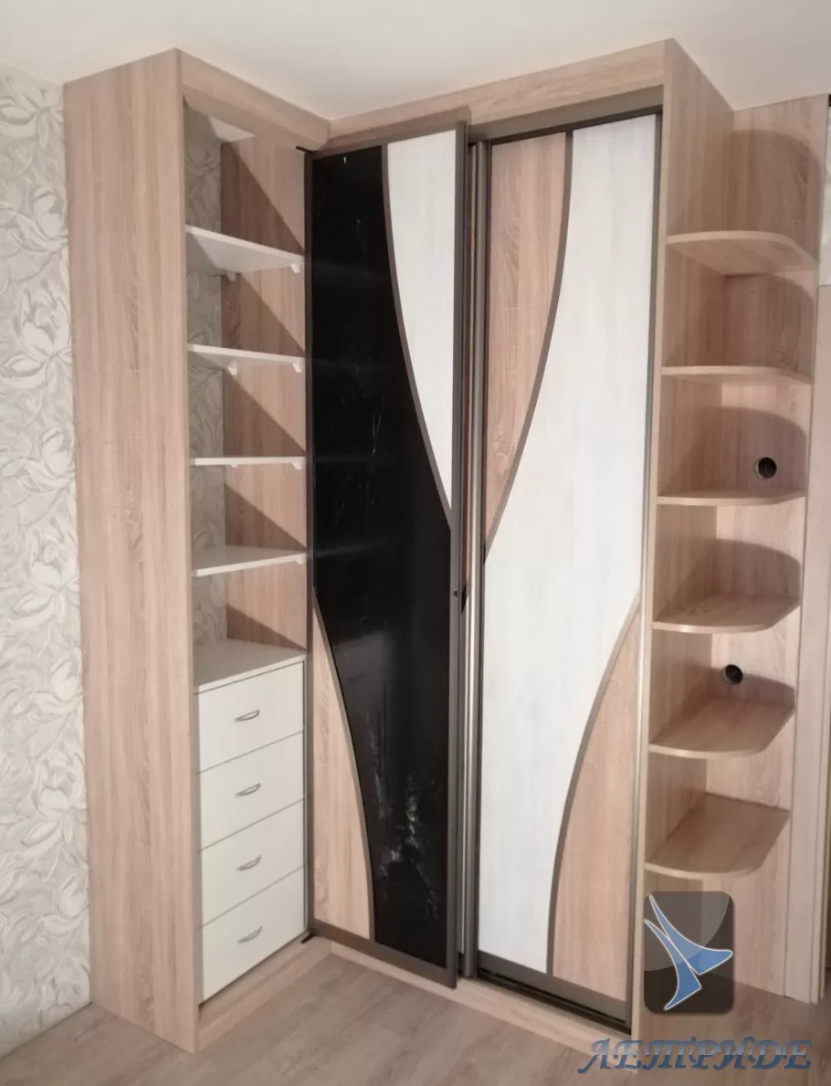 Шкаф-купе угловой с боковыми полками и выдвижными ящиками