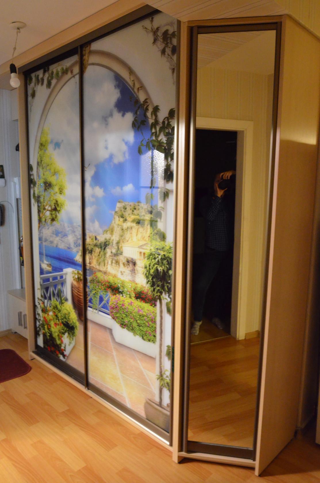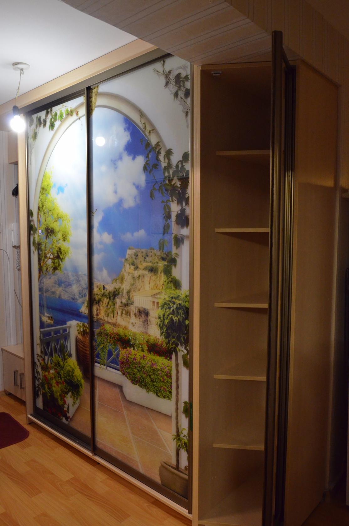 Встраиваемый угловой шкаф-купе идеально подойдет для габаритной прихожей. Центральные створки украшены яркой фотопечатью с изображением летних мотивов. Шкаф отличается удобной конструкцией короба, в котором можно хранить одежду и обувь. Угол шкафа функционален: он оснащается распашной дверью с зеркалом, за которой располагаются полки.
