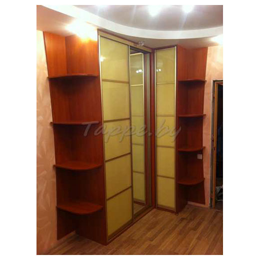 Угловой шкаф-купе включает три створки и открытые боковые полки с обеих торцов. Боковые створки заполнены лакобелем бледно-желтого цвета, центральная створка – зеркалом.