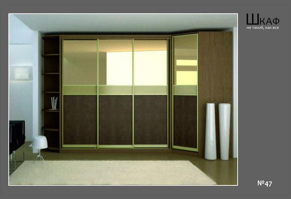 Двери наполовину зеркальны, выполнены в золотистом профиле. Корпус и часть фасадов сделана из ЛДСП. Возможна различная цветовая гамма, модель может быть исполнена как в темных, так и в светлых тонах.