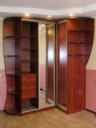 Шкаф-купе по краям комплектуется радиусными элементами и полками открытого типа. Три створки шкафа остеклены по периметру зеркалом серебро. Наполнение шкафа предусматривает полки открытого типа и выдвижные ящики.