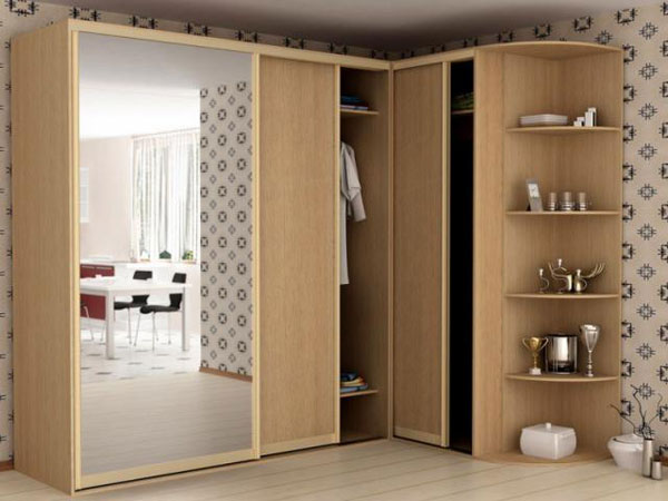 Угловой шкаф-купе обладает широкими створками, одна из которых – зеркальна. Приятный дизайн модели украсит интерьер вашей комнаты. Изнутри модель обладает несколькими секциями для различных видов одежды.