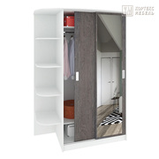 Шкаф-купе представляет собой угловую модель с серебристым фасадом. Основание окрашено в цвет венге. Посередине имеется зеркало, то есть вы в любой момент можете внимательно себя осмотреть. Грамотно организованное внутреннее наполнение поможет без особого труда разместить все ваши вещи.