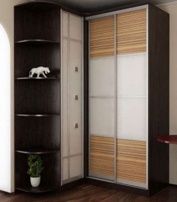 Шкаф-купе исполнен в сочетании трех цветов. Благодаря угловой конструкции и небольшим габаритам модель не займет много места в вашей комнате. Функциональным дополнением станут боковые полки.
