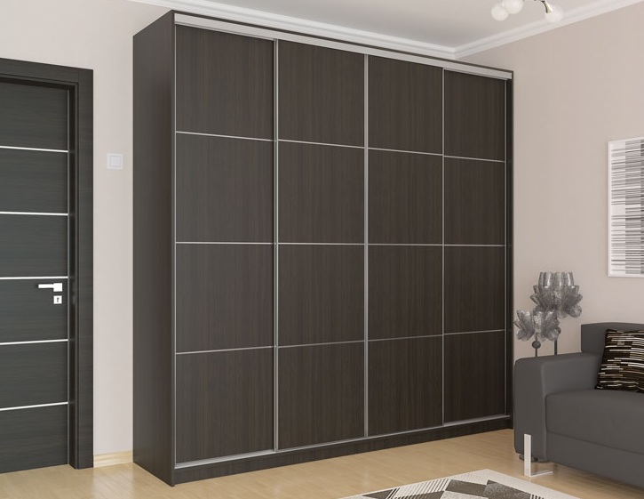 Емкий шкаф-купе шириной 1760 мм выполнен из ЛДСП в цвете темного дуба венге.