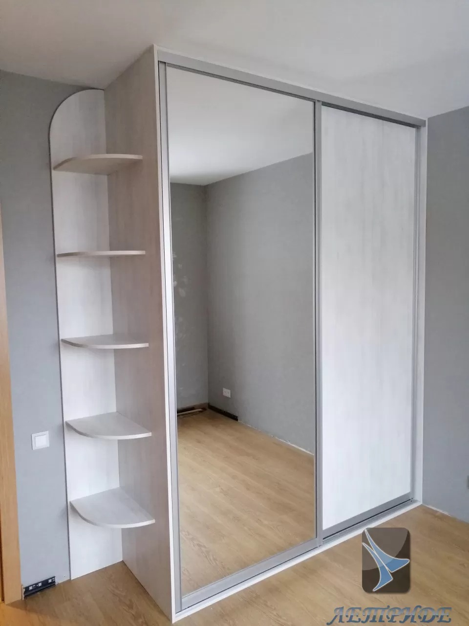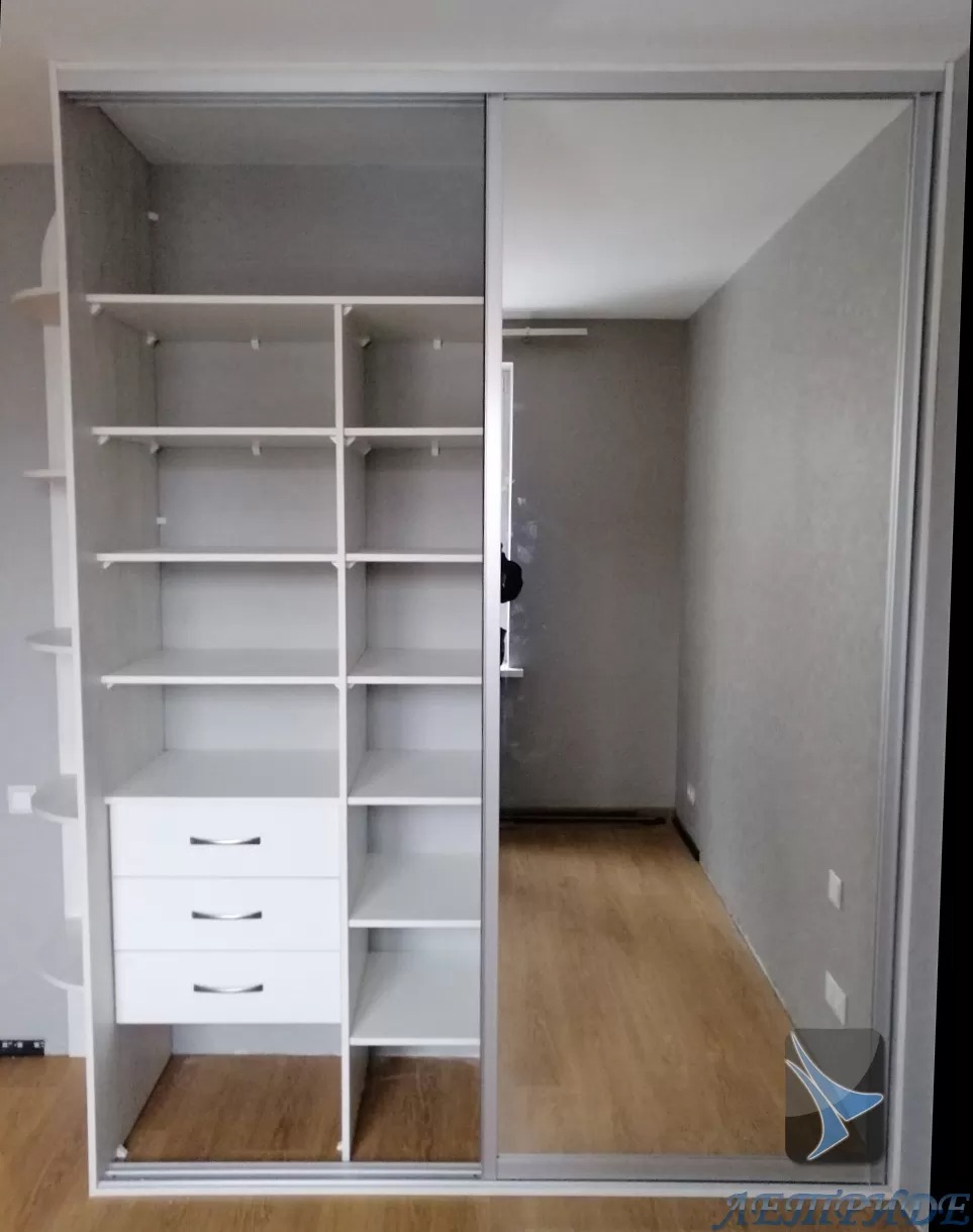Узкий шкаф-купе с зеркалом на одной из створок. Внутри полки, ящики и штанга.