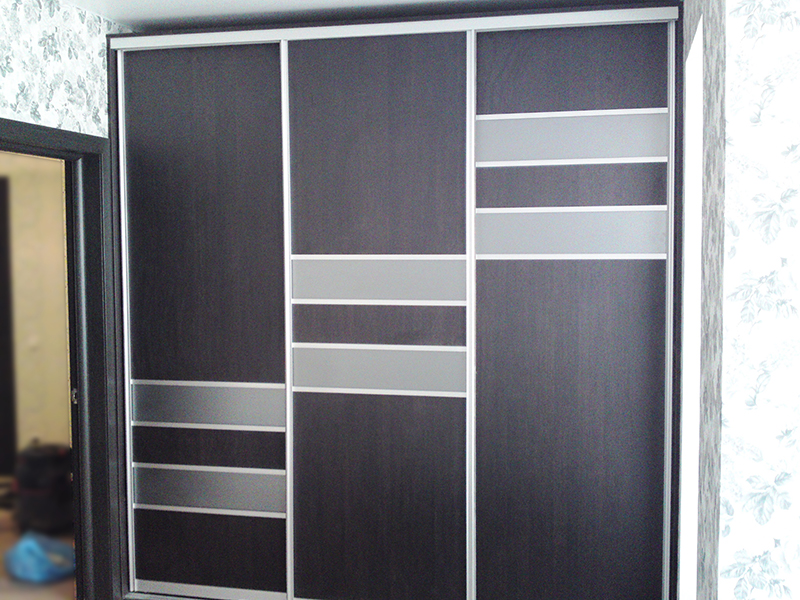 Встраиваемый шкаф-купе обладает большой вместительностью и современным внешним видом. Шкаф оснащен темя раздвижными створками, которые плавно и бесшумно открываются и закрываются. Фасад модели представлен в темном цвете со светлыми вставками лакомат.