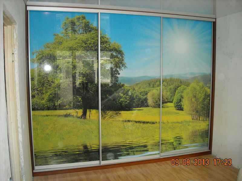 Модель линейного шкафа-купе прекрасно впишется в любой интерьер, создавая очень приятную и уютную атмосферу. Три раздвижные створки декорированы красочным рисунком в виде летнего пейзажа, выполненным при помощи фотопечати по современным технологиям. За счет чего со временем рисунок не поблекнет и будет радовать каждый день.