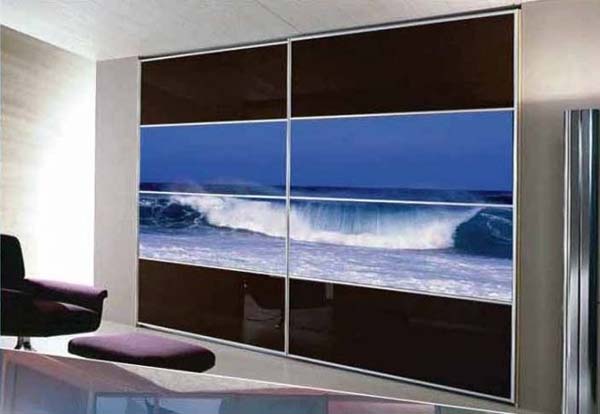 Створки шкафа-купе декорированы фотопечатью с ярким изображением надвигающейся волны. Встроенный шкаф эргономично вписывается в пространство стены и подходит для жилой комнаты или прихожей.