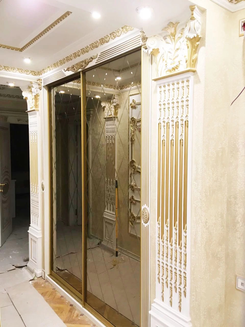 Декор зеркалом. Необычный дизайн. Открытые полки.
