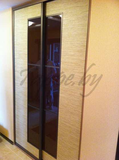 Очень компактная и многофункциональная модель линейного шкафа-купе встроена в небольшую нишу в стене, за счет чего используется все полезное пространство. Раздвижные створки выполнены в бежевом цвете с яркой древесной текстурой и вставками из глянцевого коричневого стекла. Также дополнены темным профилем.