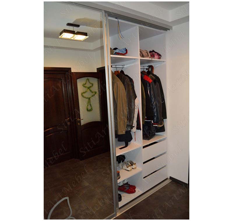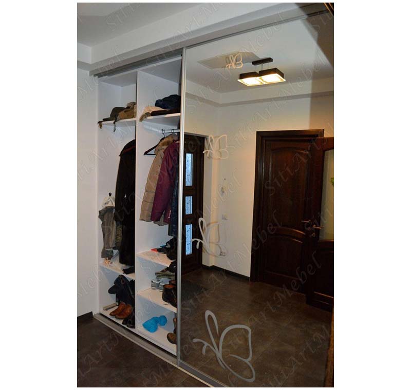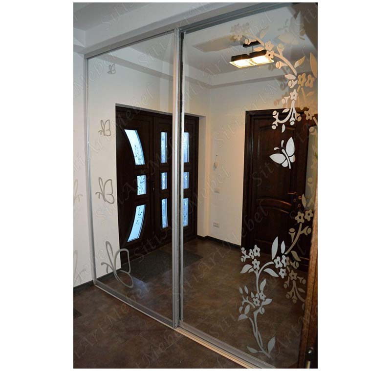 Встроенный шкаф-купе украшен оригинальным пескоструйным узором. Зеркальные раздвижные створки работают плавно и бесшумно за счет современной системы. Удобное внутреннее наполнение позволит с комфортом разложить одежду всей вашей семьи.