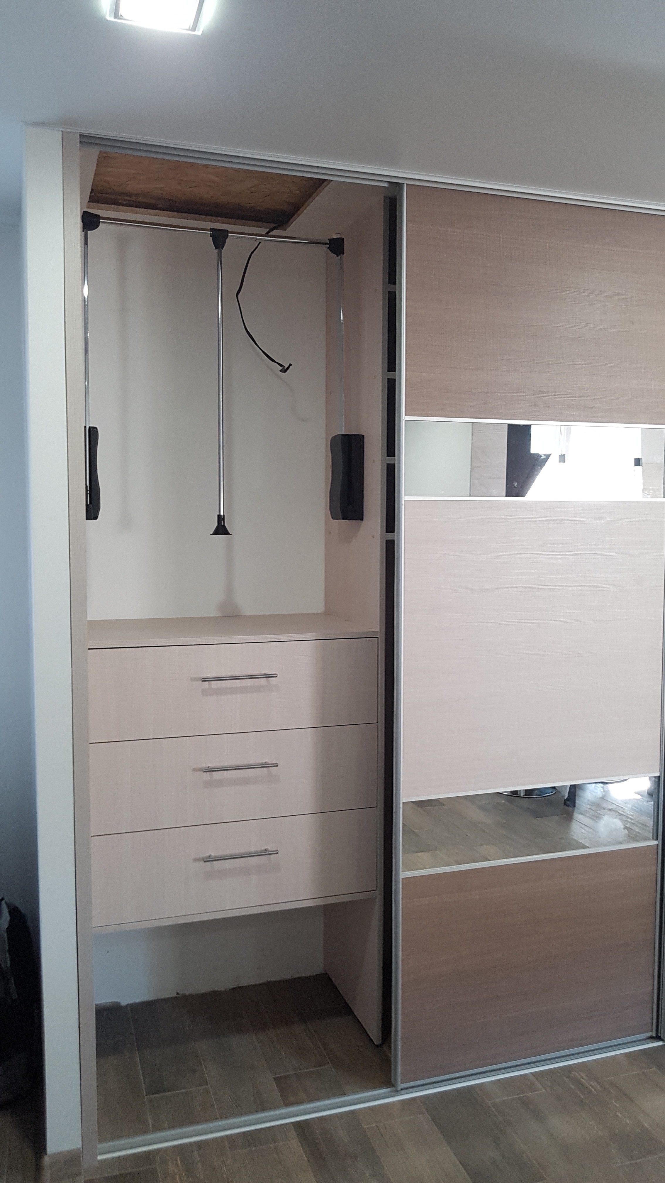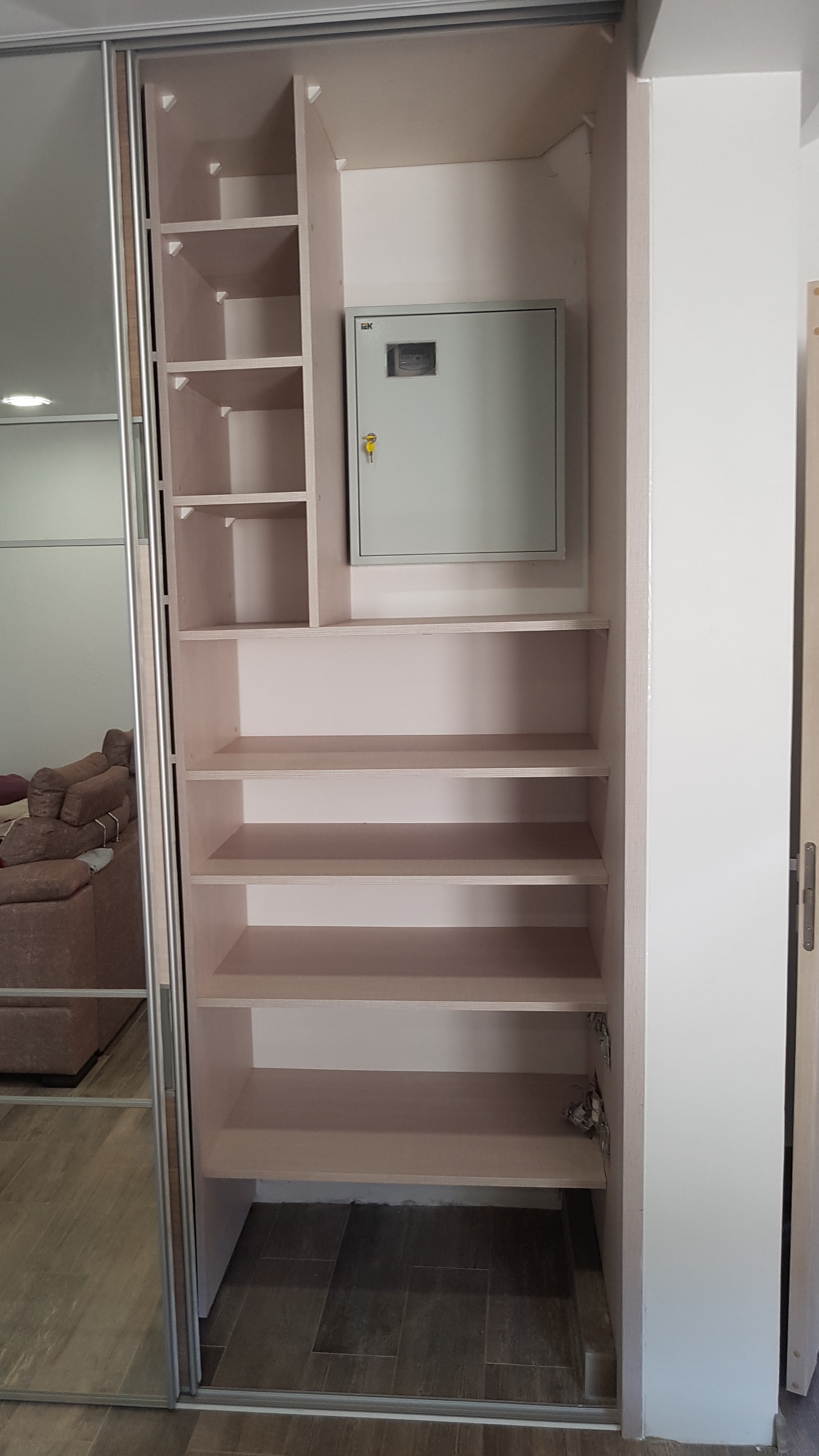 Шкаф-купе узкий с зеркальным фасадом. Внутри штанга и полки.