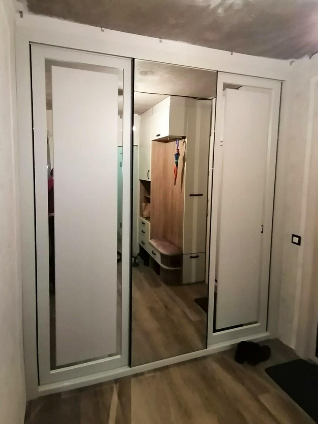 Шкаф-купе с двумя фасадными зеркалами. Корпус из светлой ЛДСП с древесным рисунком.