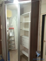 За раздвижными дверями находятся 2 секции со штангой и полками и шуфлядный блок.