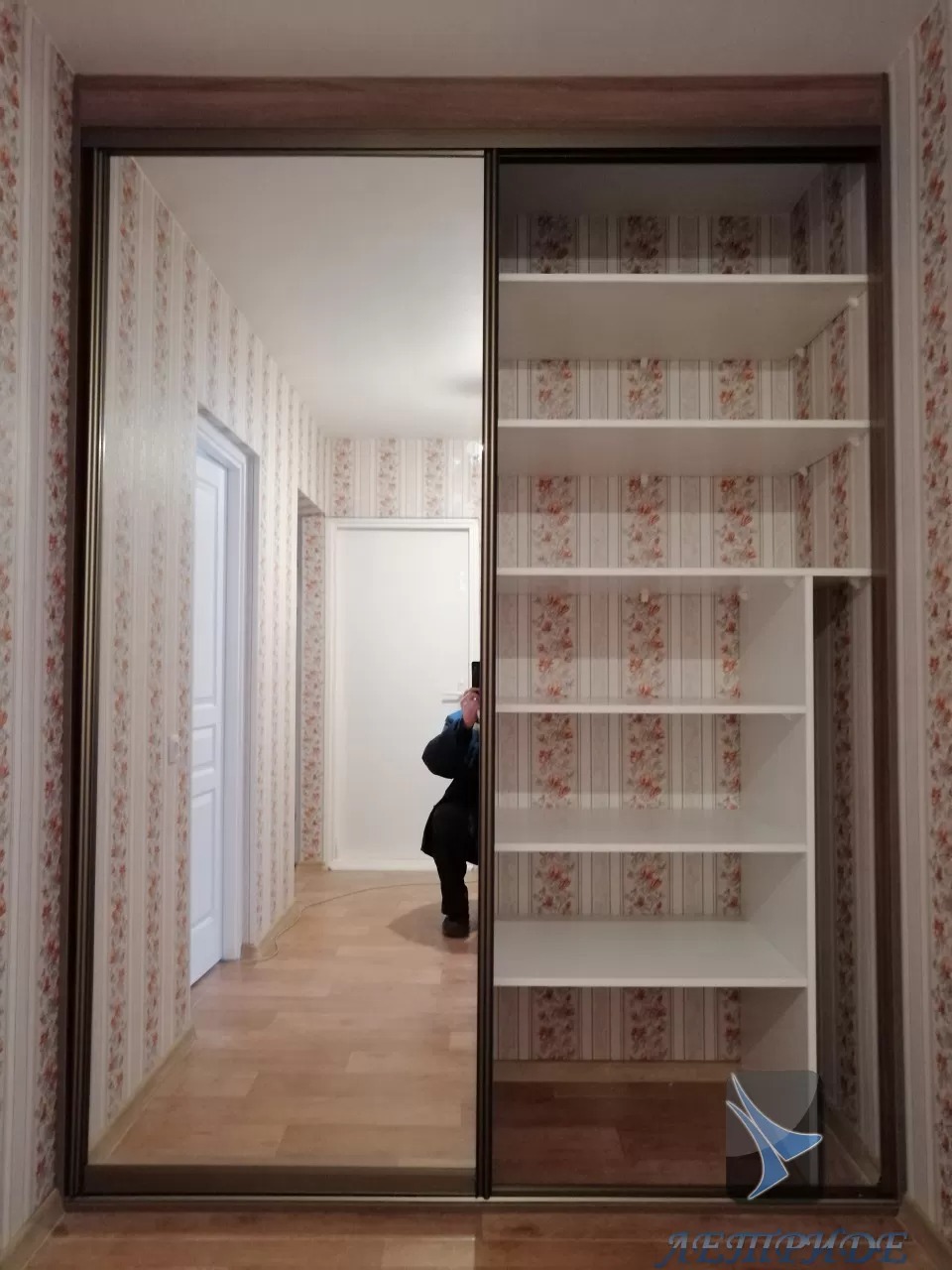 Двери без зеркал, стеллаж с полками справа. Ширина 185 см.