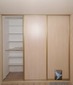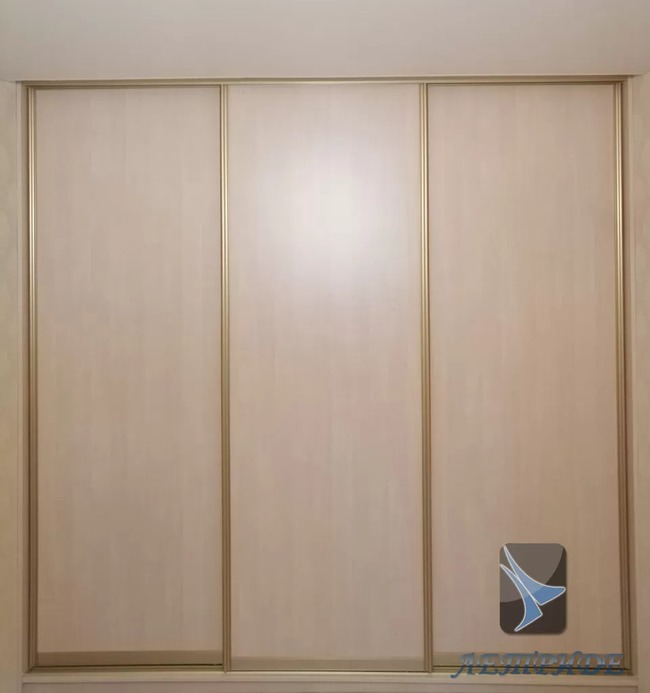 Шкаф-купе оснащен зеркалом во весь рост. Светлые фасады имеют рисунок дерева.