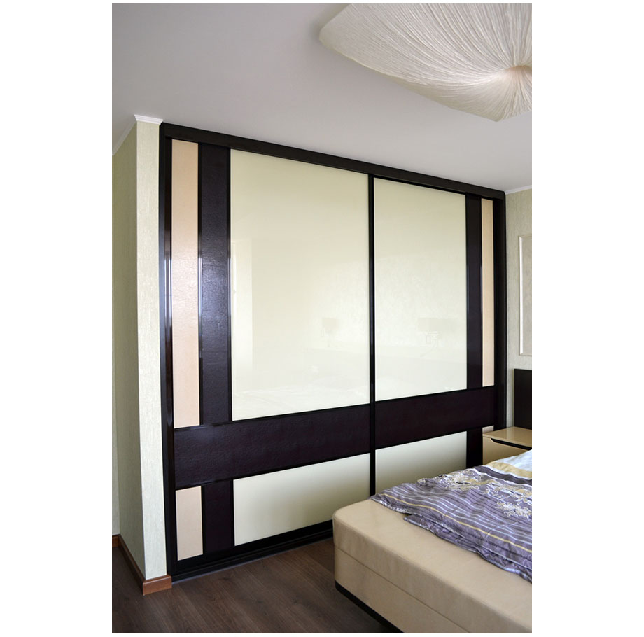Встроенный двухстворчатый шкаф-купе привлекает своим оригинальным дизайном. Модель изготовлена из экологичных и качественных материалов с использованием современной фурнитуры. Светлые фасады конструкции интересно украшены вставками в цвете венге, являющимся сегодня очень популярным тоном при оформлении мебели.