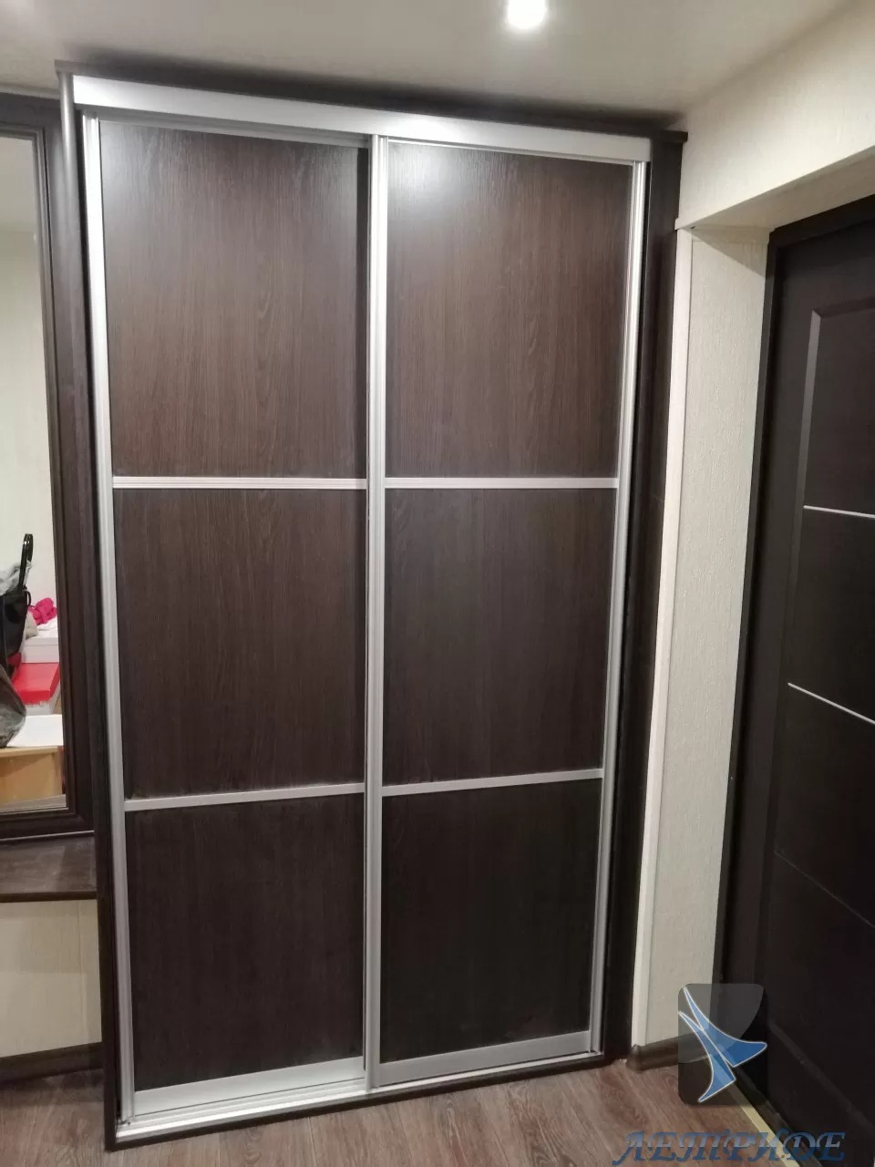 Корпусный шкаф-купе древесного оттенка с одним зеркалом. Ширина 112 см.
