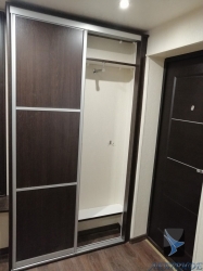Шкаф-купе встроенный в угол изготовлен в линейной форме. Фасаду характерно темно-коричневое цветовое исполнение, которое смотрится благородно и стильно. Светлый металлический профиль подчеркивает фасад.