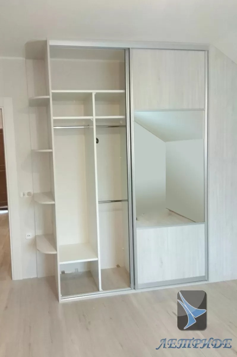 Корпусный двухцветный шкаф-купе с одним зеркалом. Одно отделение внутри. Ширина 112 см.