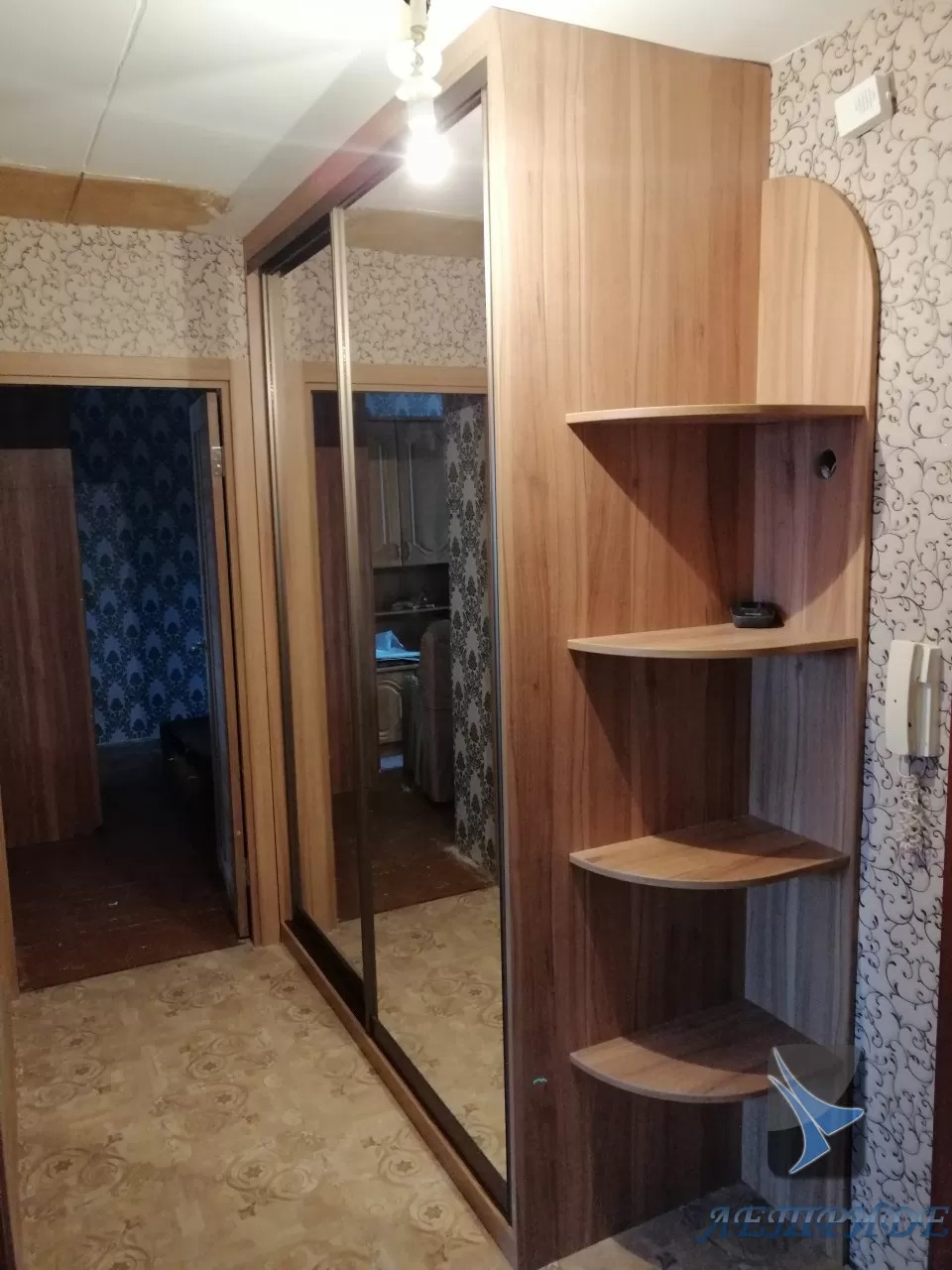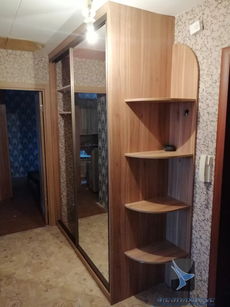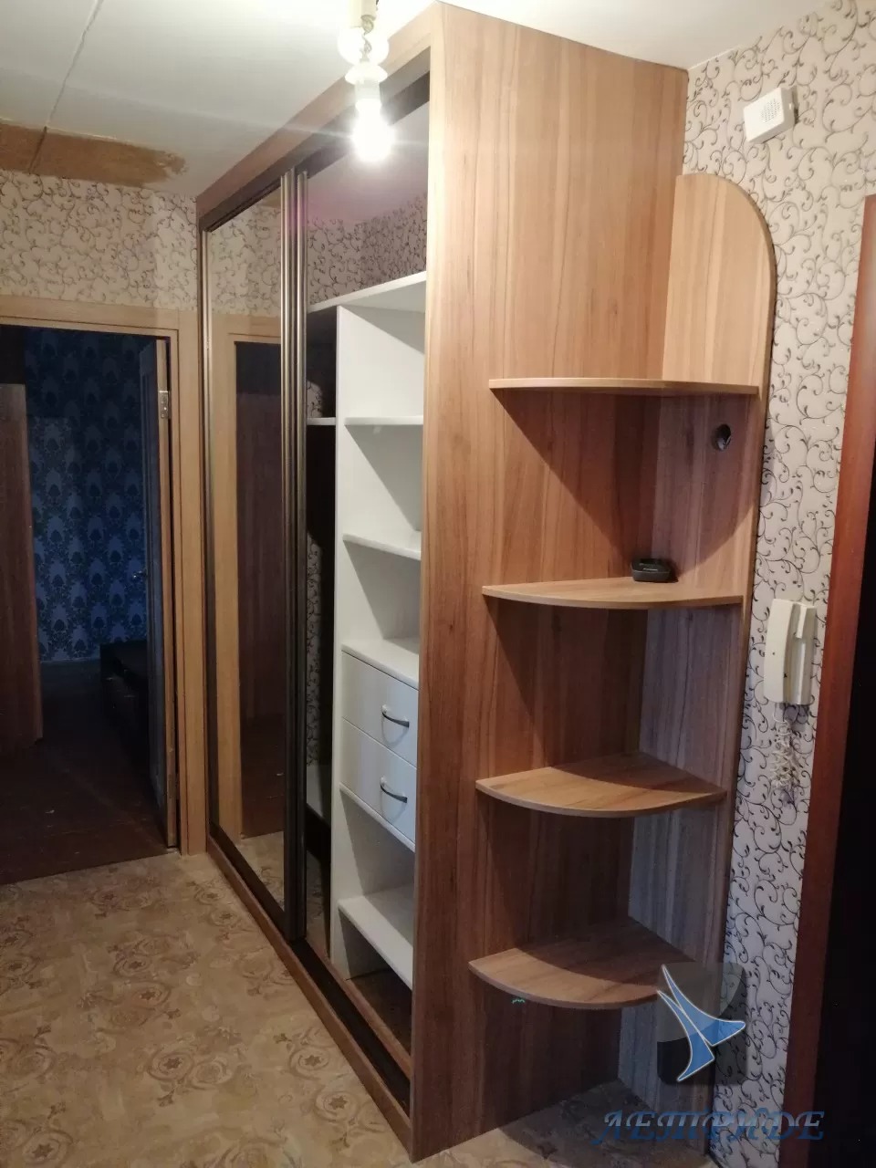Шкаф-купе встроенный в угол выполнен с боковыми открытыми радиусными полками. Модель содержит две двери-купе, декорированные зеркалом. Золотистый профиль превосходно дополняет общий вид, подчеркивая форму зеркала.