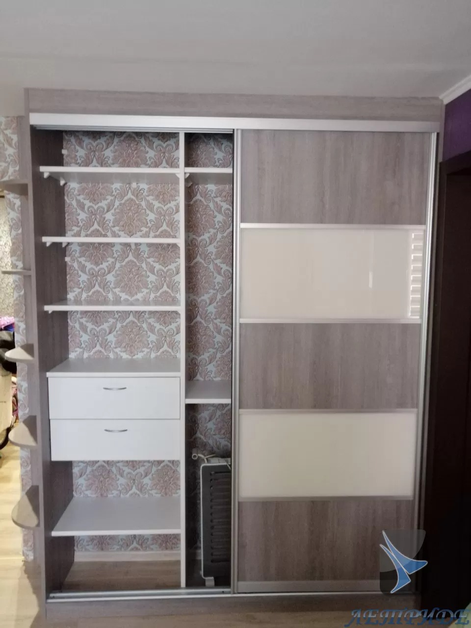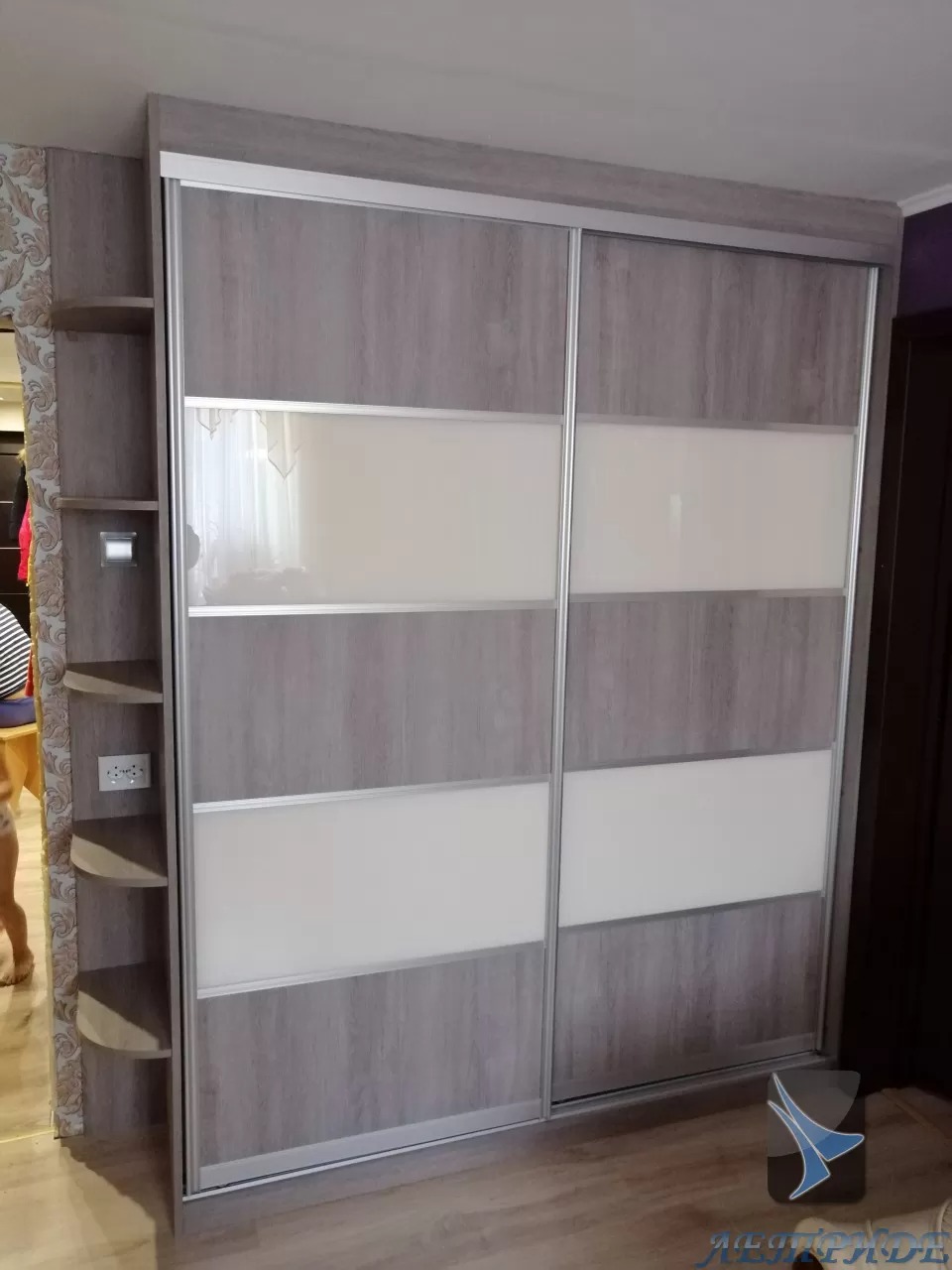 Шкаф-купе встроенный в угол с приставными полками изготовлен в холодной цветовой гамме. Часть мебели в молочном цвете дополнена глянцем. Изделие выполнено в линейной форме.