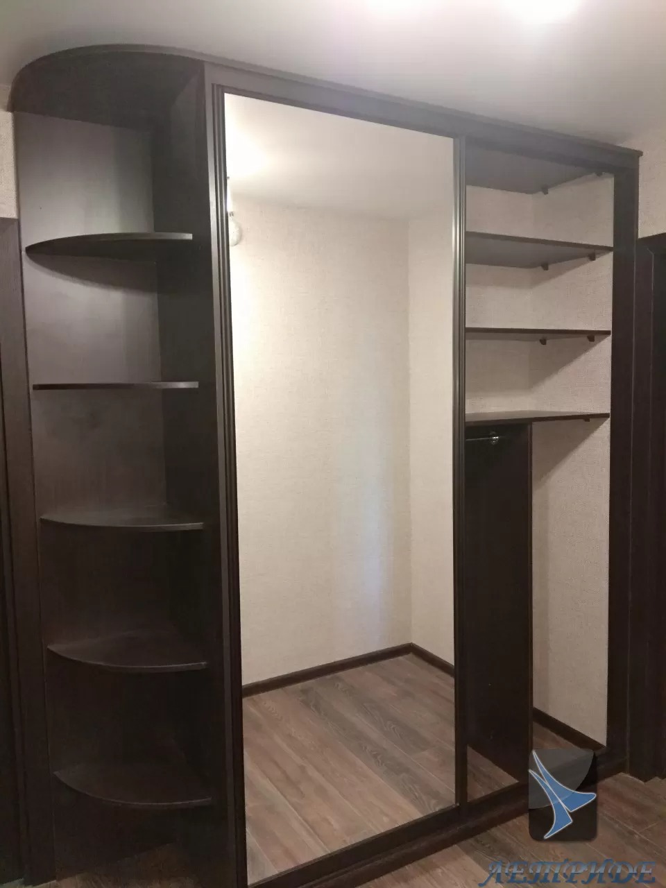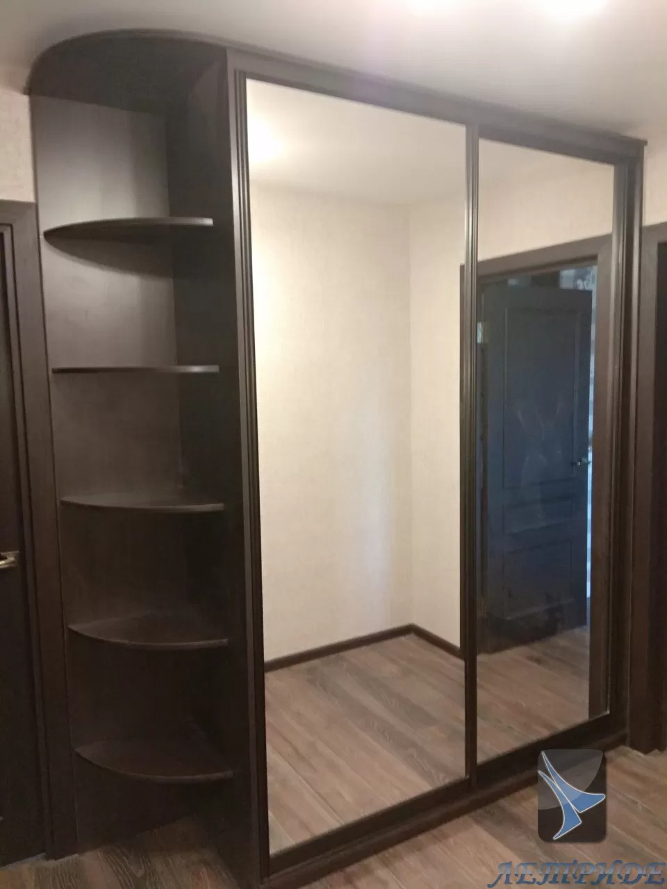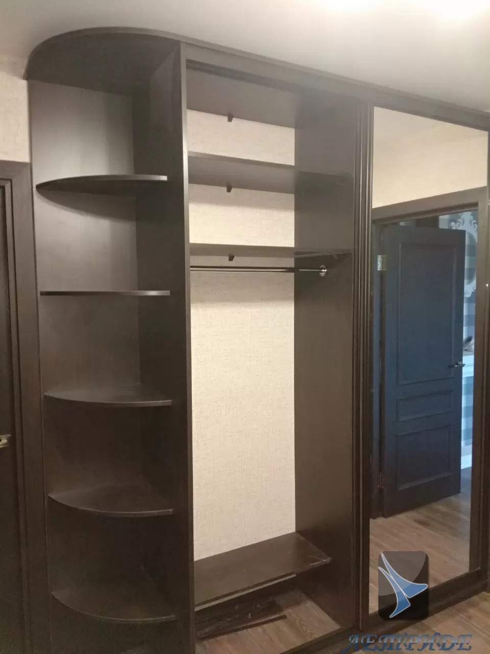 Шкаф-купе изготовлен в классическом коричневом цвете. Благородный темный окрас фасада дополняет зеркало. Боковые полки сбоку открытого типа. Линейная конструкция подходит как для прихожей, так и для спальни.