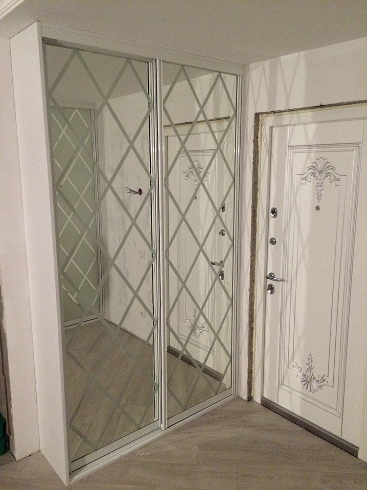 Двустворчатый линейный шкаф-купе имеет очень компактную и вместительную конструкцию, позволяющую устанавливать его в небольших и узких помещениях прихожей. Две раздвижные створки изготовлены из больших зеркал и декорированы ромбовидным пескойструйным рисунком. Такой дизайн прекрасно подойдет не только для современных, но и для классических интерьеров.
