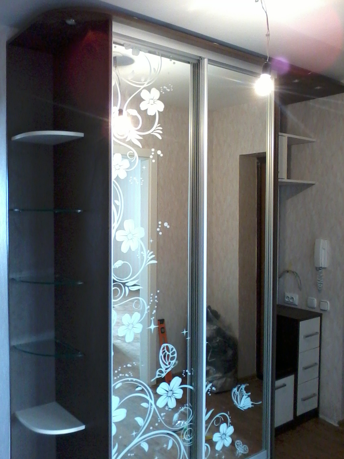 Шкаф-купе отличается продуманным внутренним наполнением, позволяющим грамотно складывать вещи. Зеркальный фасад украшен цветочными узорами, которые зададут настроение всему интерьеру. Качественные материалы изготовления обеспечат длительный срок эксплуатации.