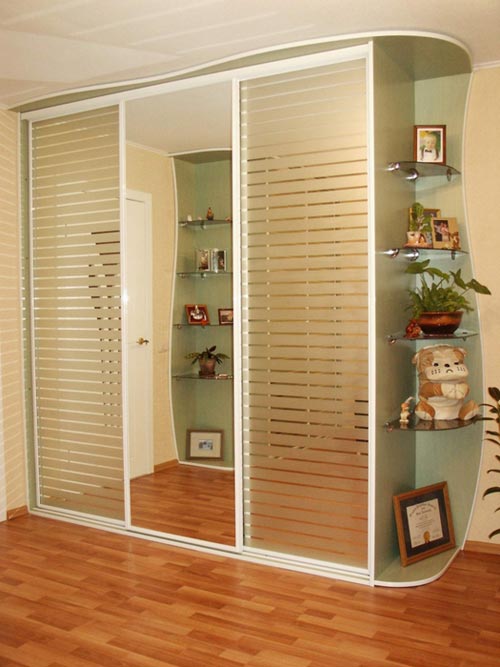 Угловой шкаф-купе с открытыми полками и фигурными зеркалами
