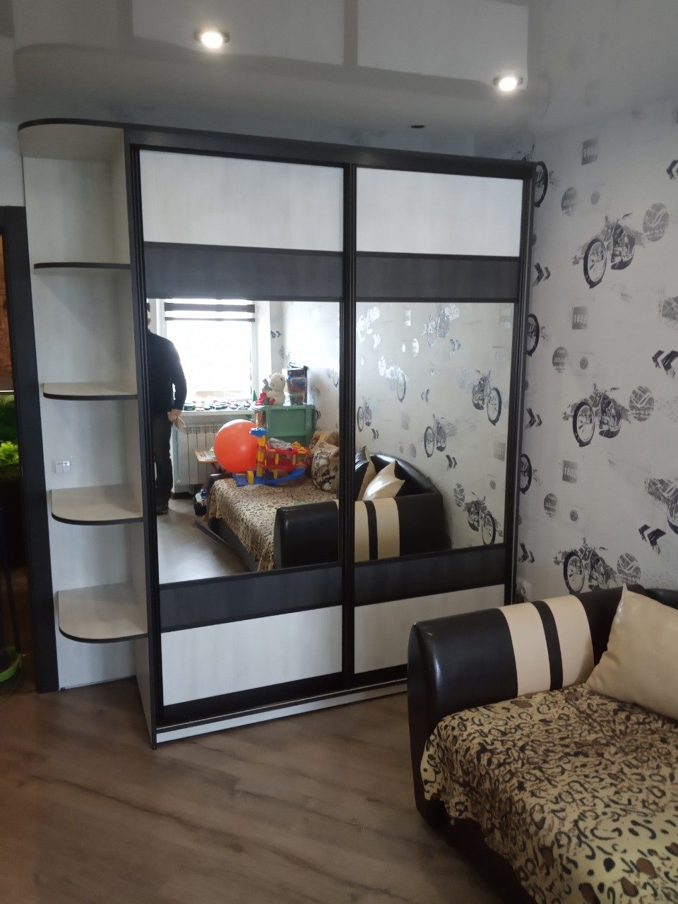 Данная модель зеркального шкафа оптимально подойдет для спальной комнаты любых габаритов. Шкаф отличается качественным функционалом, в дополнение к которому устанавливаются четыре наружные полки для аксессуаров. Шкаф-купе выдержан в комбинации черного и белого цвета.