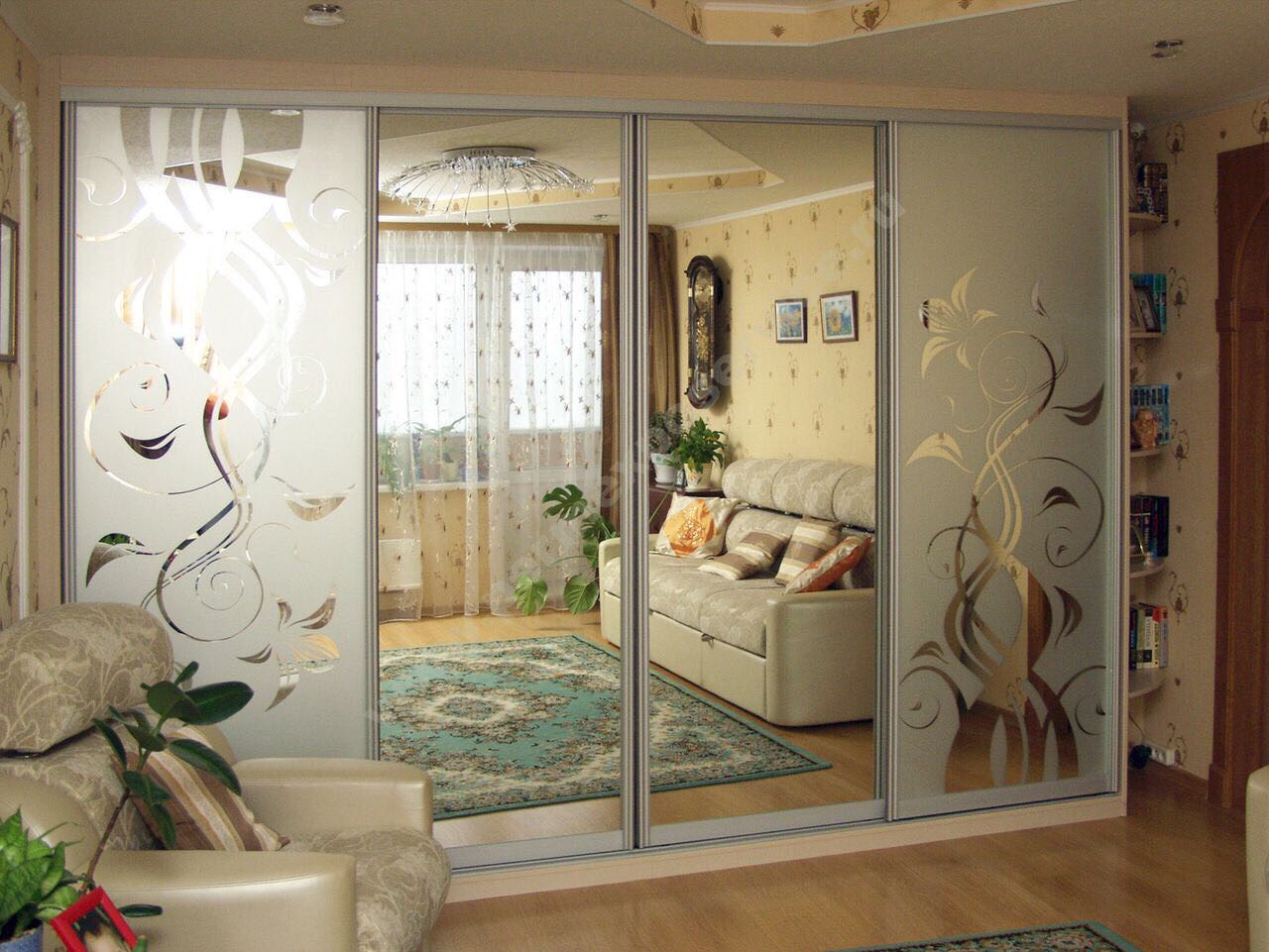 код 88597Шкаф в четыре створки. Комбинация зеркальных дверей и в пескоструйной обработке.