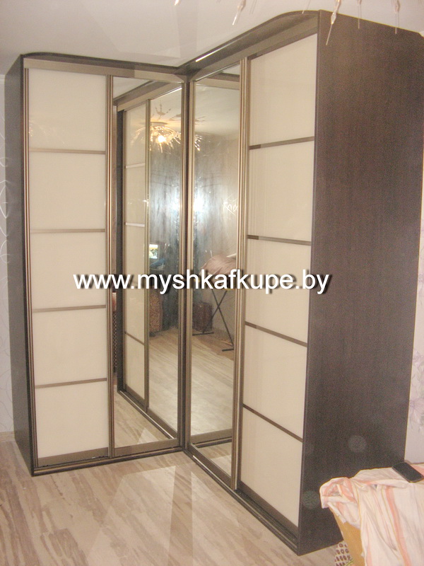 Шкаф-купе в корусе под темный орех/ венге с козырьком на четыре створки, расположенных в формате 2х2. Зеркальный угол обрамлен по краям створками из кремового лакобеля, разделенного на квадраты металлическими перегородками под бронзу в тон профилю.