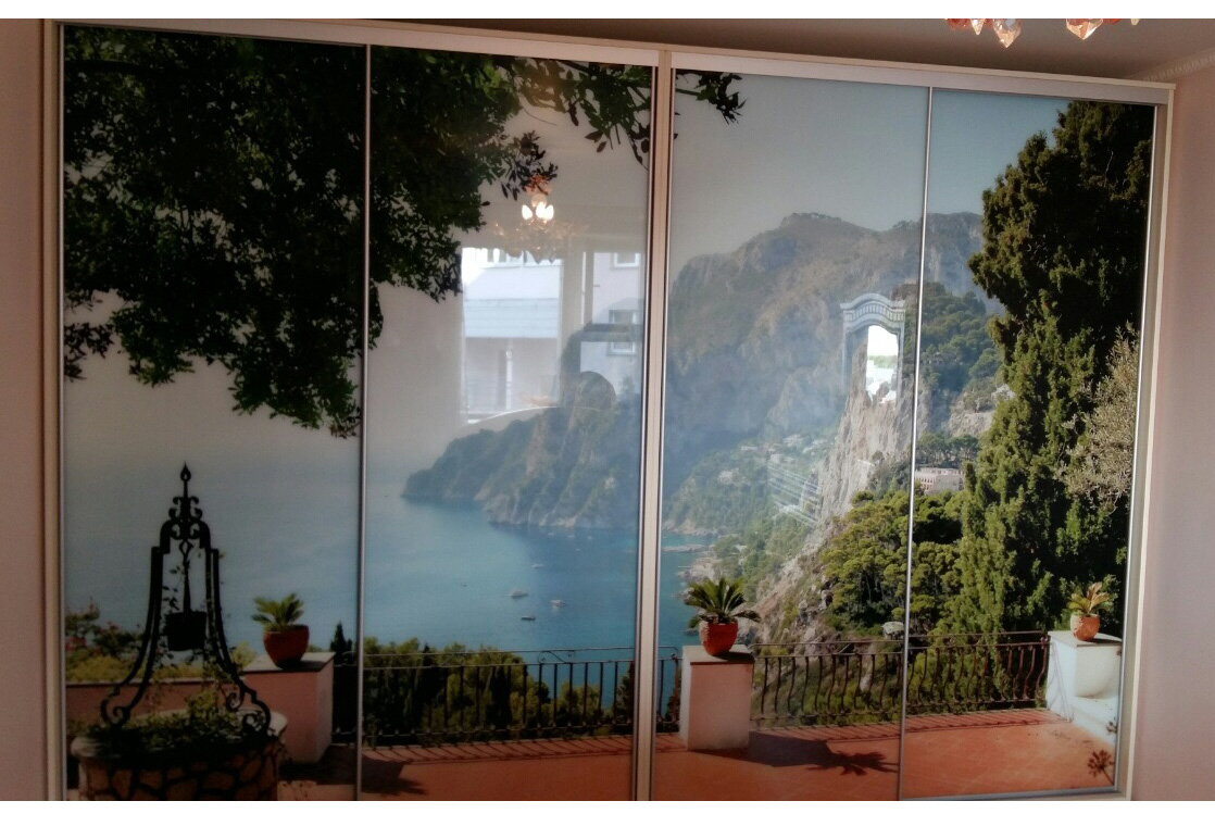 Встроенный шкаф-купе линейной конструкции выполнен в алюминиевом профиле и обладает большой вместительностью, за счет чего вы с легкостью можете разместить все необходимые вещи. Четыре раздвижные створки декорированы яркой фотопечатью с пейзажем, котороя выполнена по современным технологиям, за счет чего картинка не блекнет и очень четкая.