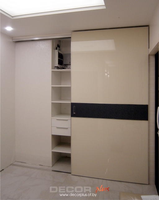 код 85100Встроенный гардероб в прихожую на две створки. Фасад: кремовый глянец с темной горизонталью.